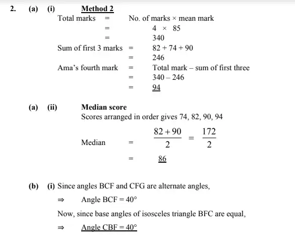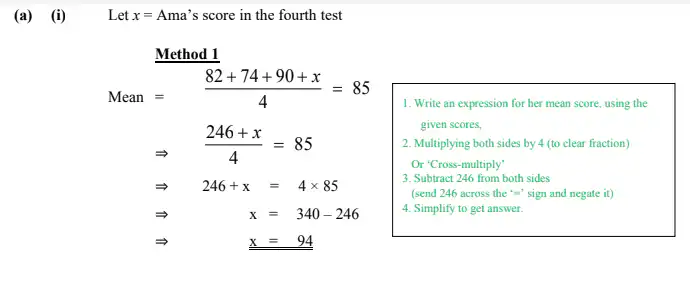 - (a) (i) Ama scored 82, 74 and 90 in three tests. What mark should she score in the