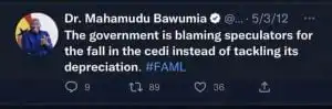 The Vice President and Head of the Economic Management Team, Vice President Dr. Mahamudu Bawumia, disagrees with the President, in principle, about the relationship between speculation and currency depreciation. This principle of Dr. Mahamudu Bawumia was expressed in a tweet on 5th March 2012. He was then addressing the then President, John Dramani Mahama. And it will be fair to apply that same principle to President Nana Addo.