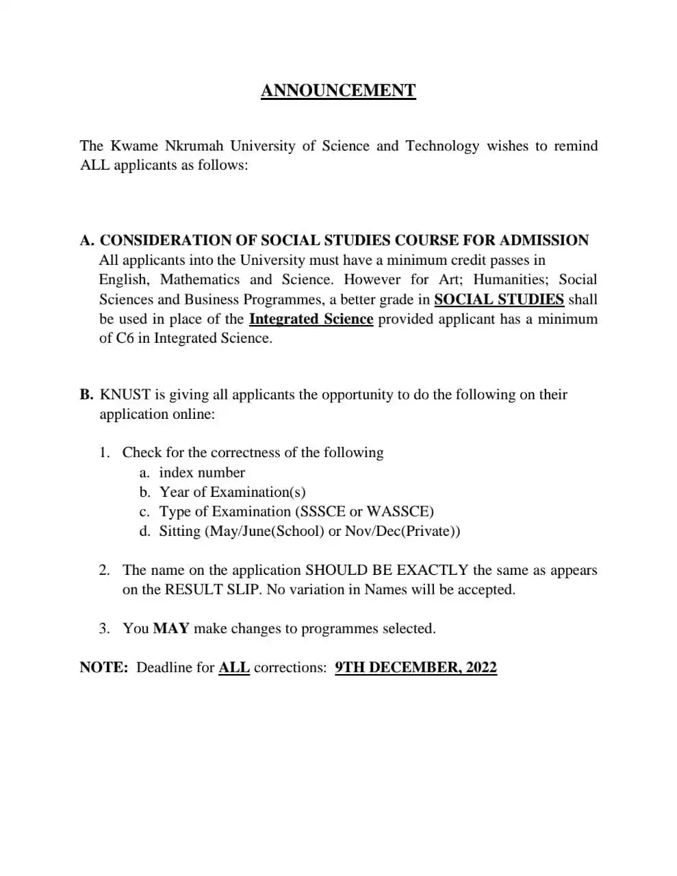 Kwame Nkrumah University of Technology (KNUST) has released new 2023 Admission updates from KNUST to 2022 WASSCE candidates.