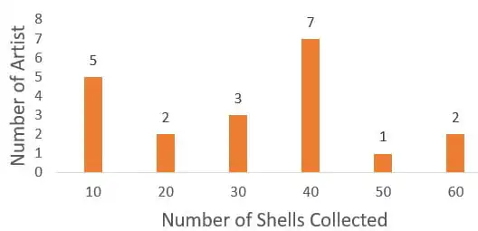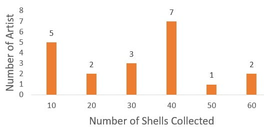 7. The diagram below shows the number of shells collected by twenty (20) artists at the beach. If 40 shells are needed to create a chain, how many of the artists have enough shells to create a chain?