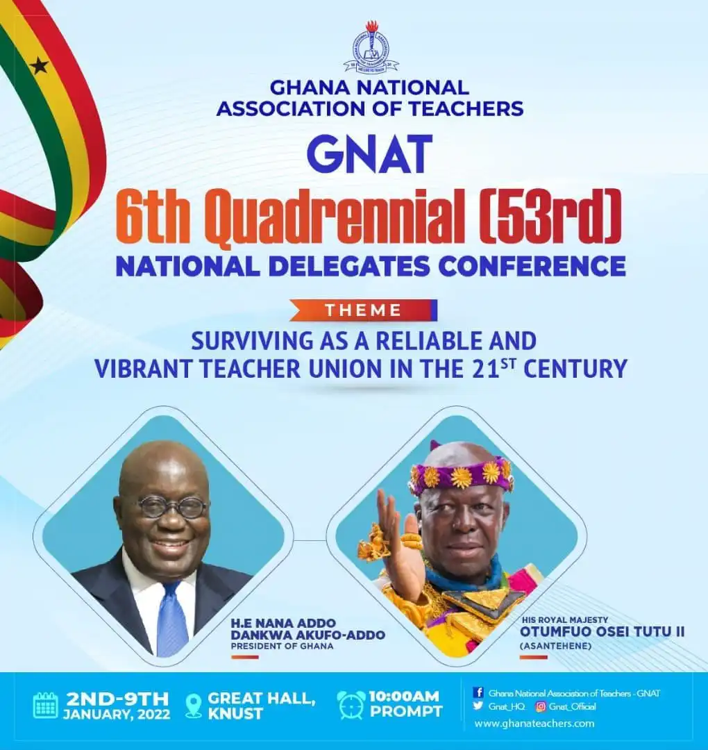 The 6th Quadrennial [53rd] National Delegates’ Conference of the Ghana National Association of Teachers (GNAT) starts today 2nd January 2022 and ends on 9th January 2022.