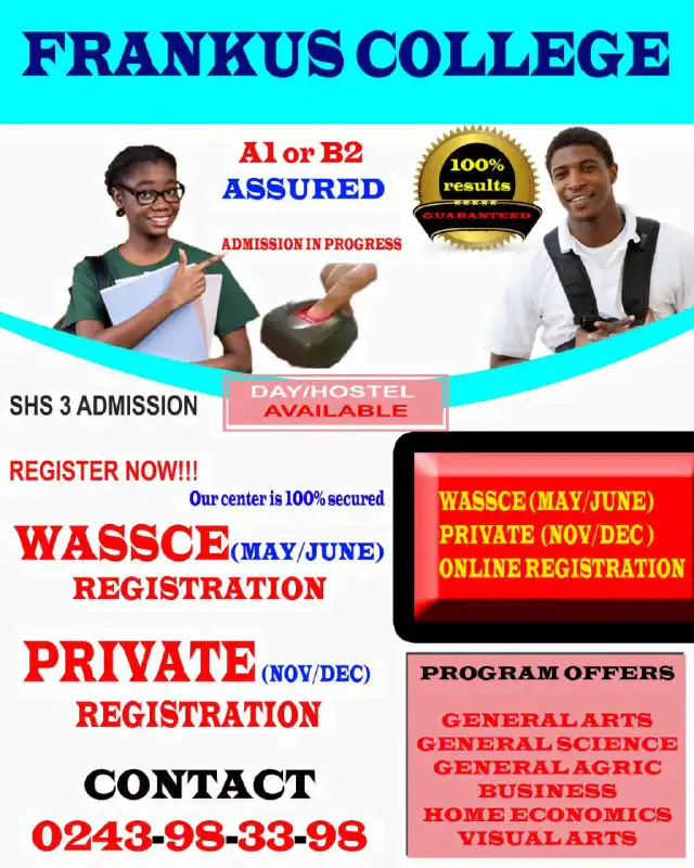 Admission is in progress all year round and students who are preparing for the WASSCE and the NOV/DEC and need effective and result-oriented tuition should Call Frankus College, your No1 Remedial School on 0243983398 or Chat them on WhatsApp by clicking the link [GRADE A and B at Frankus]