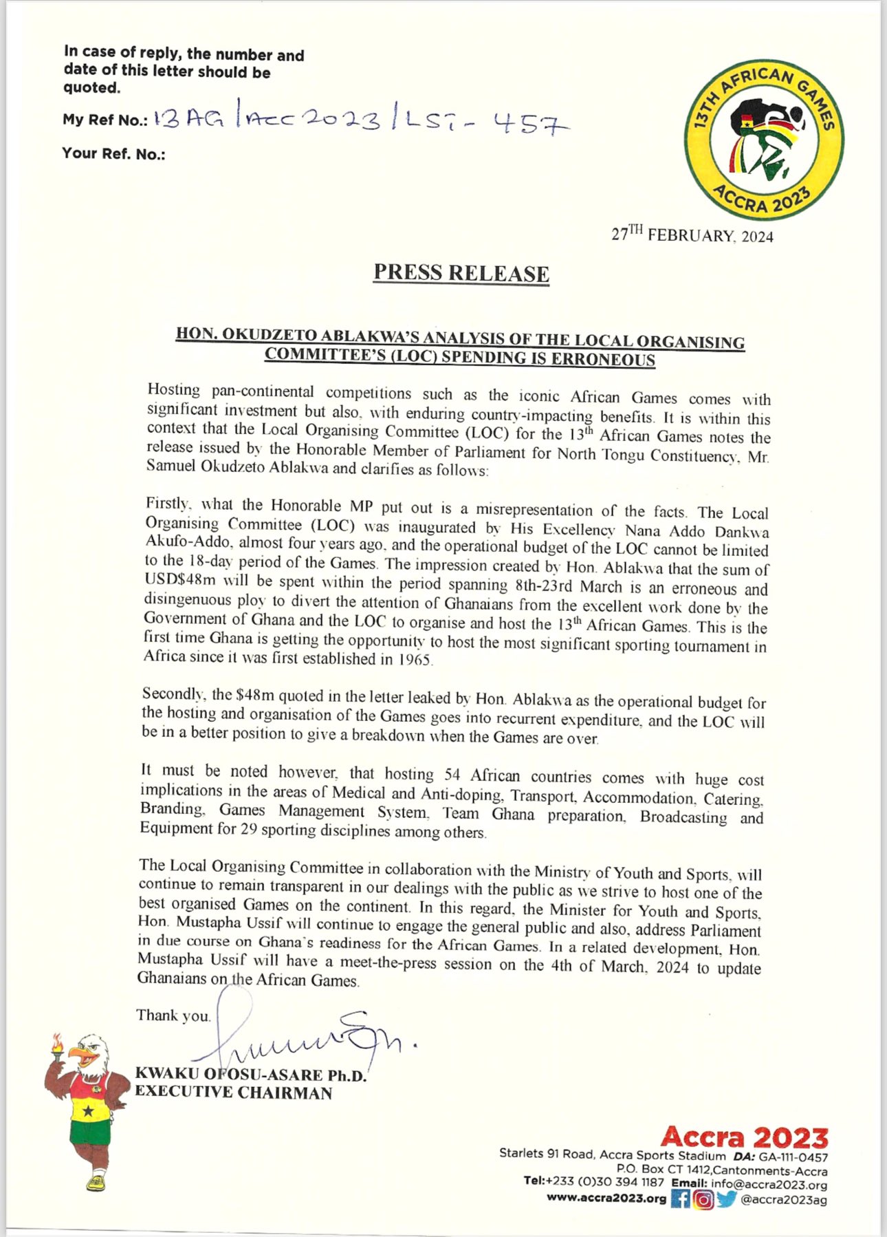 According to the LOC, “the 48 million quoted in the letter leaked by Hon. Ablakwa as the operational budget for the hosting and organisation of the games goes into recurrent expenditure, and the LOC will be in a better position to give a breakdown when the games are over.”