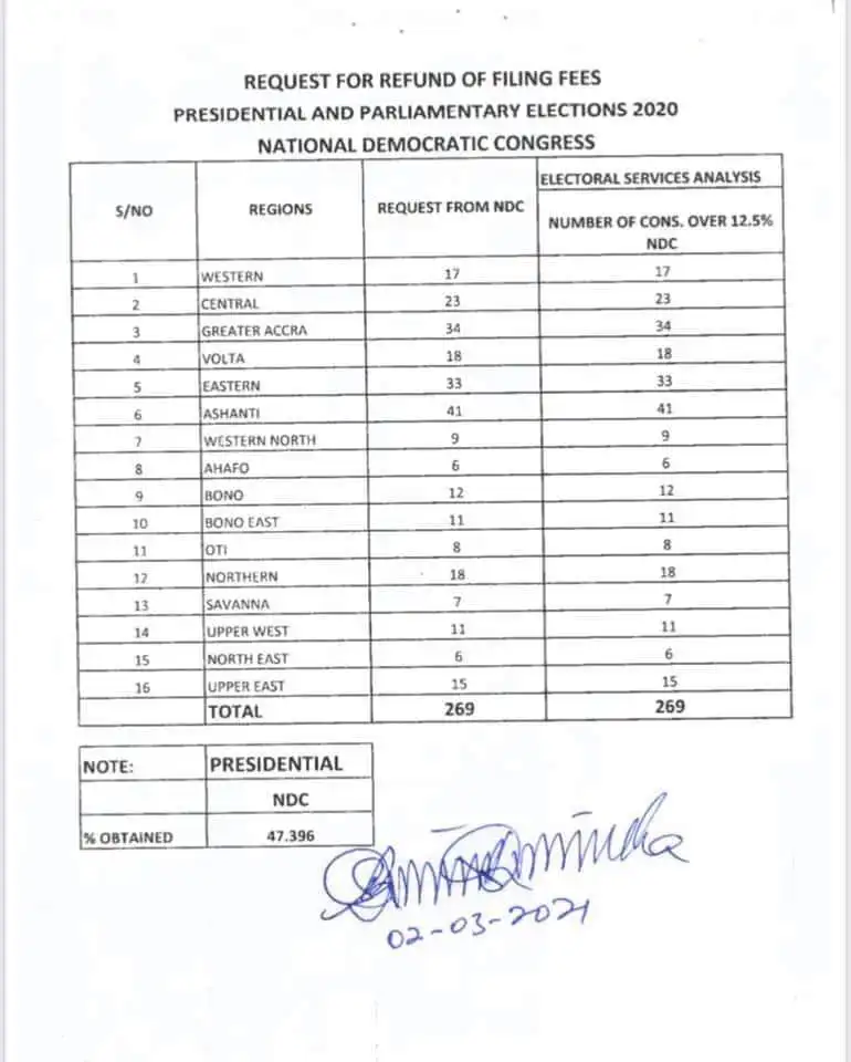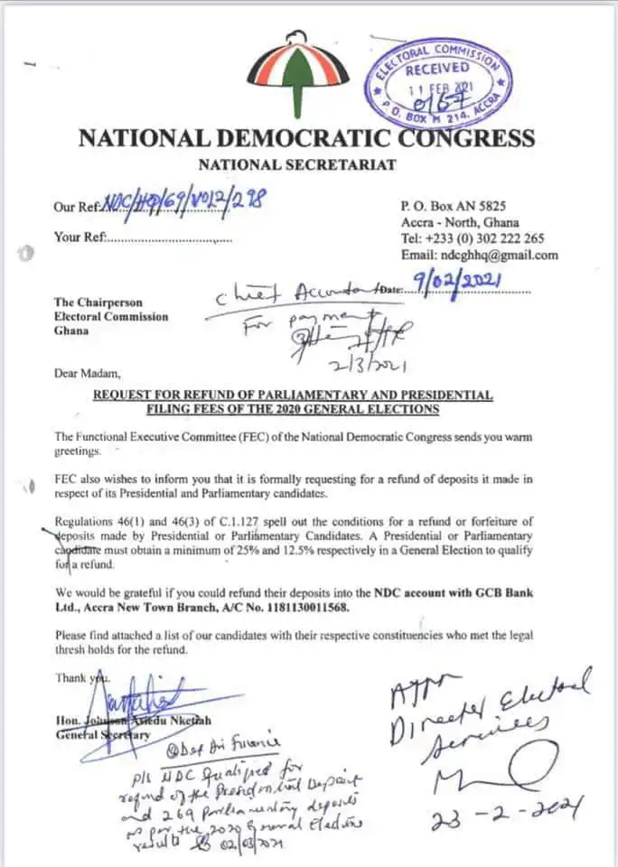 A letter to the Electoral Commission signed by Johnson Asiedu-Nketia indicated the Functions Executive Committee of the National Democratic Congress formally requesting a refund of the deposit Made in respect of its presidential and parliamentary candidates.