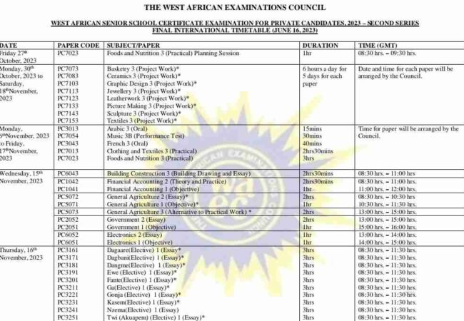 The West African Examinations Council(WAEC) has released the final timetable for 2023 WASSCE-Private(NovDec) candidates. As...