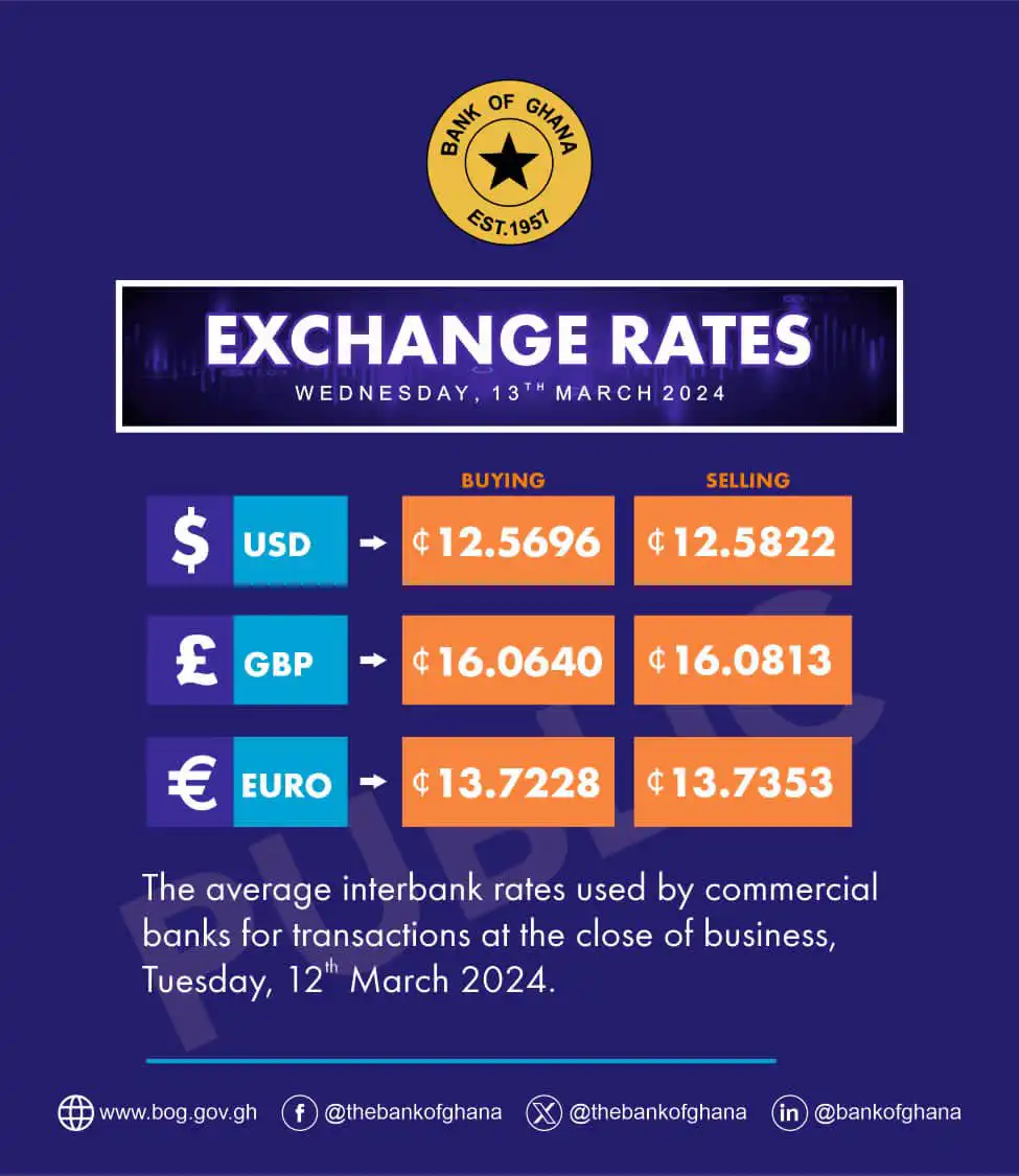 The Bank of Ghana Exchange Rates for the Dollar, Pounds, and Euro are out on March 13th, 2024.