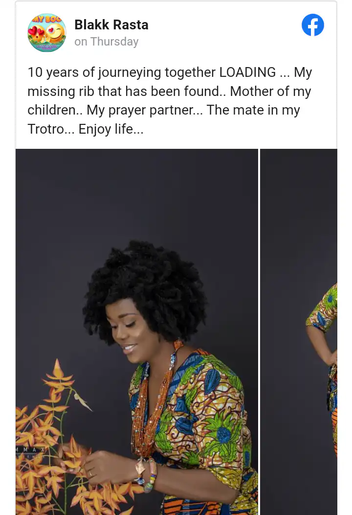 “10 years of journeying together, loading… my missing rib that has been found… Mother of my children… My prayer partner… The mate in my Trotro… Enjoy life,” Blakk Rasta captioned the photos.