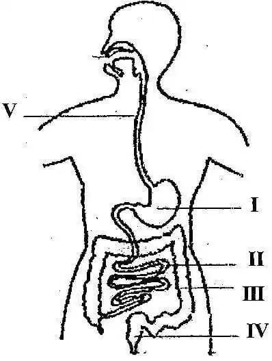 (d) (i) Names of the parts labelled I, II, III, IV and V