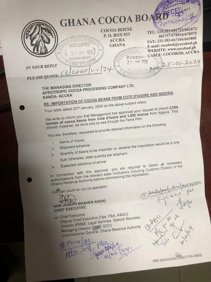 The letter dated January 25, 2024, with the heading “Re-Importation of Cocoa Beans from Cote d’Ivoire and Nigeria” has caused a lot of worry among Ghanaians. The chief executive of the Ghana Cocoa Board, Hon. Joseph Boahen Aidoo, signed the letter approving the purchase.