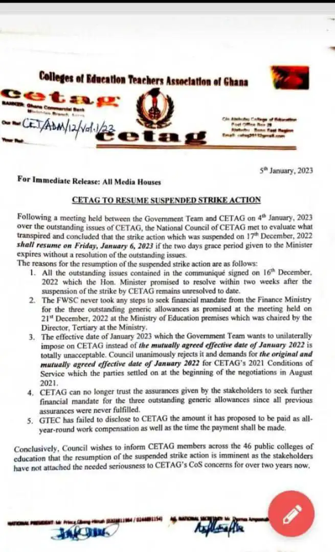 The Colleges of Education Teachers Association have resumed its nationwide strike. The decision to resume the suspended strike action followed the latest meeting between the Government Team and CETAG ON 4th January 2023. The meeting was to thrash out outstanding issues of CETAG.