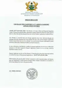 “The ministry of Foreign Affairs and Regional Integration wishes to inform the general public, particularly passport applicants about the urgent need for them to collect their printed passports from the various Passport Application Centers.