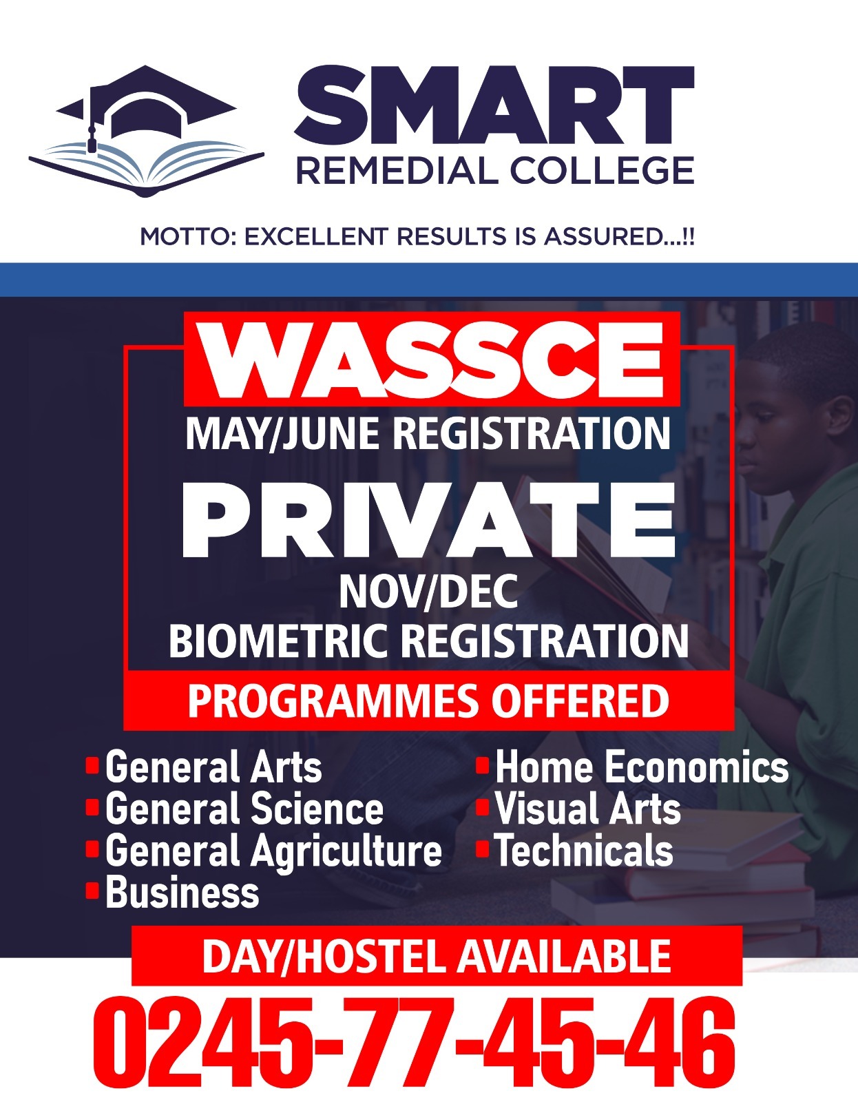 If you want to conquer WASSCE and NOVDEC without breaking a sweat in 2024, enrol at Smart Remedial College today! At Smart College, students are refined, prepared, and trained to be self-reliant and disciplined in their preparation, study, and work, leading to enviable results.