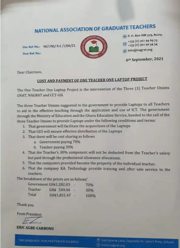 Less than 24 hours after the launch of the One Teacher One Laptop, the National Association of Graduate Teachers (NAGRAT) in a letter sighted by Ghanaeducation.org stated that the cost of Teachers Mate 1 Laptop was GH¢1831.47 and that teachers will pay GHS549.44 (30%).
