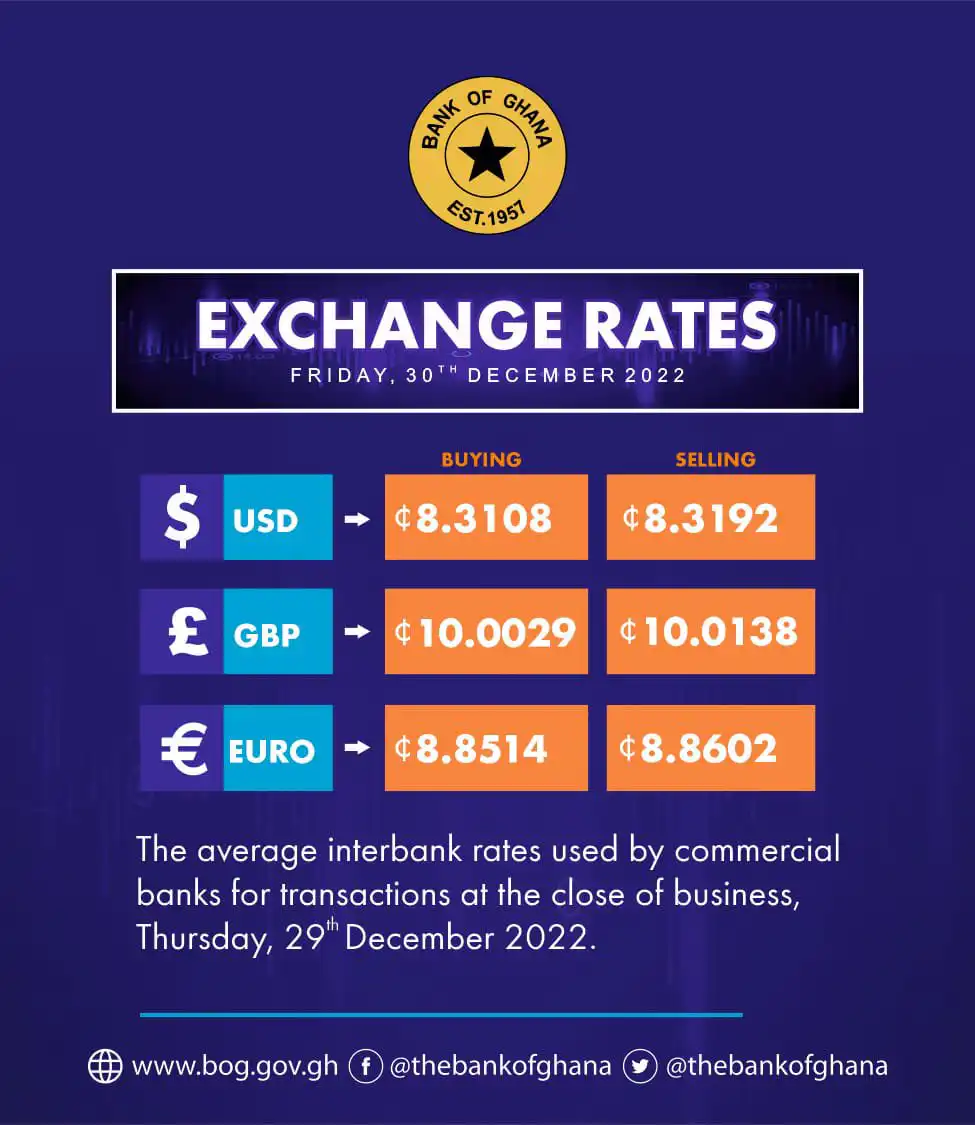 The Bank of Ghana’s interbank rates quoted on 30th December 2022 which was the last working day for buy and sell rates was approximately $1 to GHS8.31