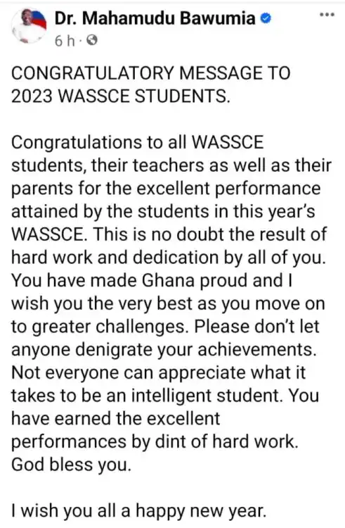 The Vice President also congratulated parents and teachers for their roles in the excellent performances of their wards in the 2023 WASSCE.