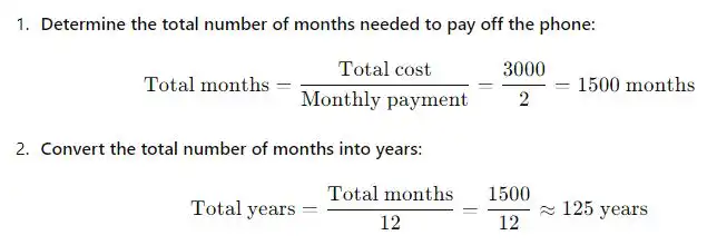 If I buy a smartphone on credit worth GHS3000 and you are to repay the phone by making a monthly repayment of GHS2.00, how many years will it take me to pay the full cost of the phone?