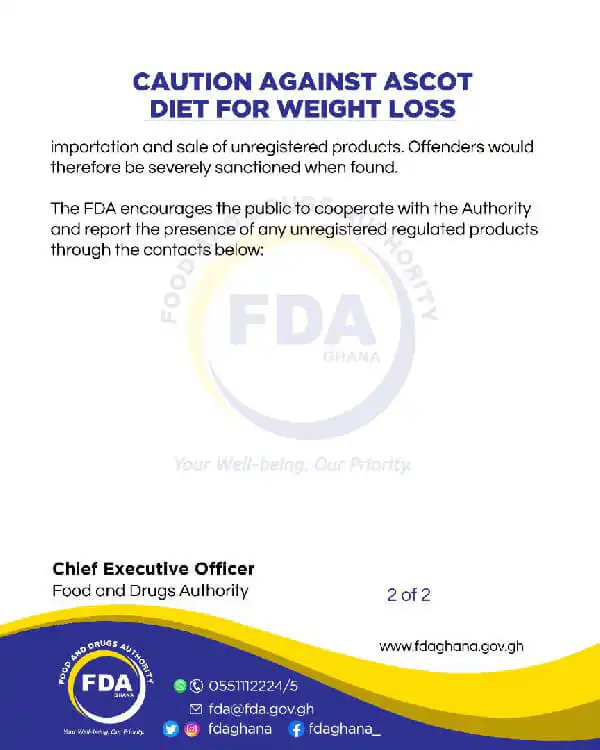 The Ghanaian Food and Drugs Authority (FDA) has asked people to stop buying and using some unregistered weight loss products because they have a lot of bad side effects.