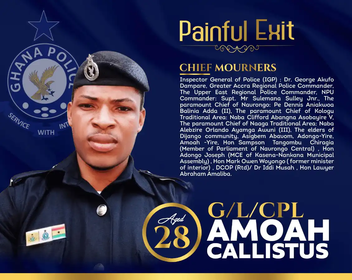 The Pre-Burial Service for the late officer of the law G/L/CPL AMOAH CALLISTUS will be held on Friday, 14th July 2023 at the St. George Catholic Church, Police Depot, Tesano from 8:30 am.