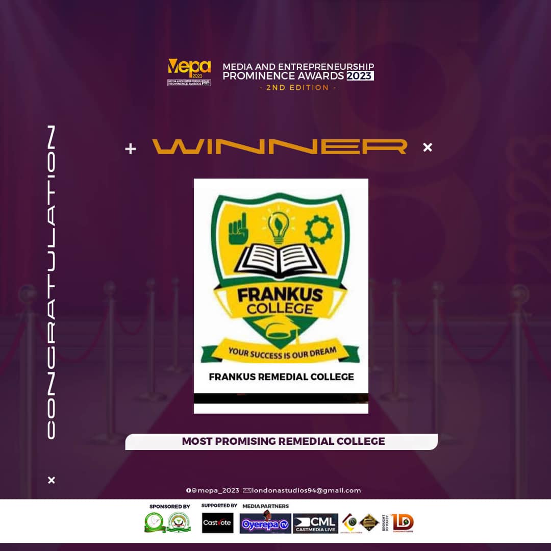 Frankus Remedial College has been declared the best remedial school in Ghana at the Media and Entrepreneurship Prominence Awards 2023 and 2024.