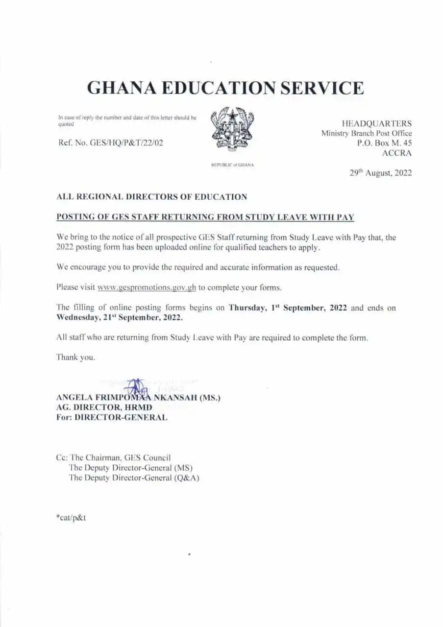 The Ghana Education Service has called on all staff returning from study leave with pay who want to be posted to apply.