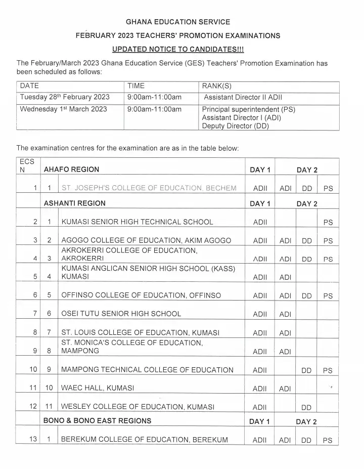 The Management of the Ghana Education Service brings to the notice of all staff due for promotion, the dates, time and centres for the February/March 2023 promotion exams.