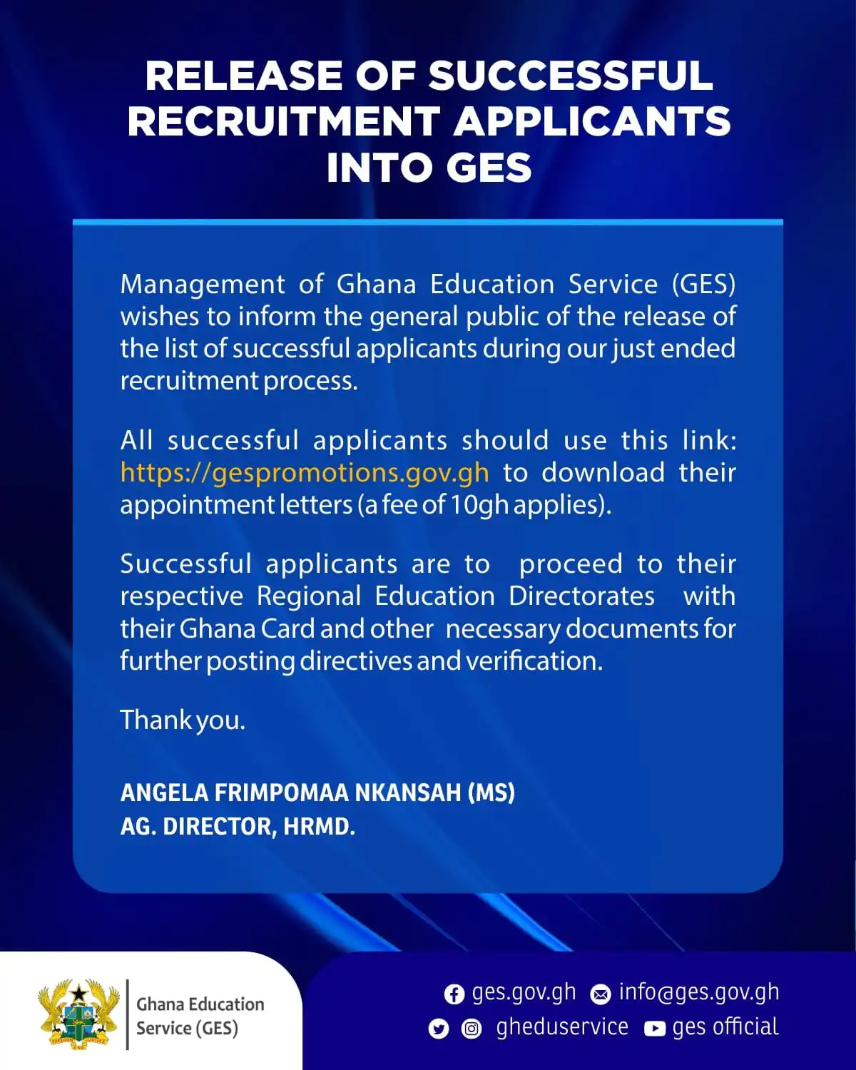 All applicants should log on to www.gespromotion.gov.gh to check where they were posted to perform their duties and to also download their appointment details at a fee of GHS10.00