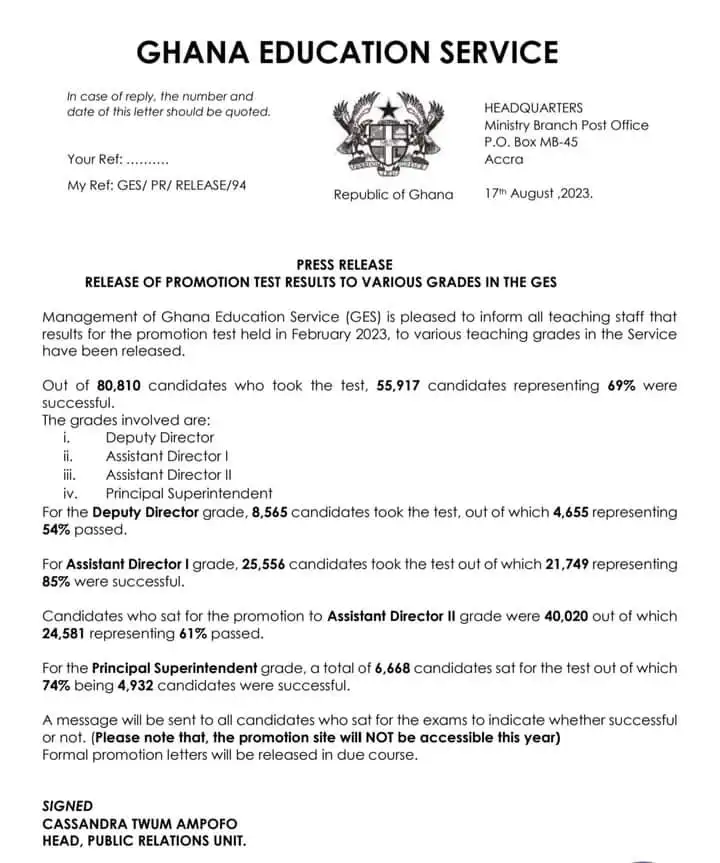 The Ghana Education Service has released the 2023 Teacher Promotion examination results. The Ghana Examination was conducted in February, this year.