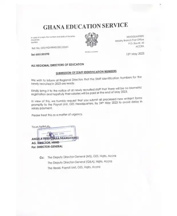 “We wish to inform all Regional Directors that the Staff ldentificafion Numbers for the newly recruited in 2023 are ready. Kindly bring it to the notice of al newly recruited staff that there wil be no biometic registration and hopefuly their salaries will be paid at fthe end of May 2023. In view of this, we humbly request that you submit all processed new entrant forms promptly to the Payol Unit, GES Headquarters, by 24 May 2023 to avoid delay in salary payment.