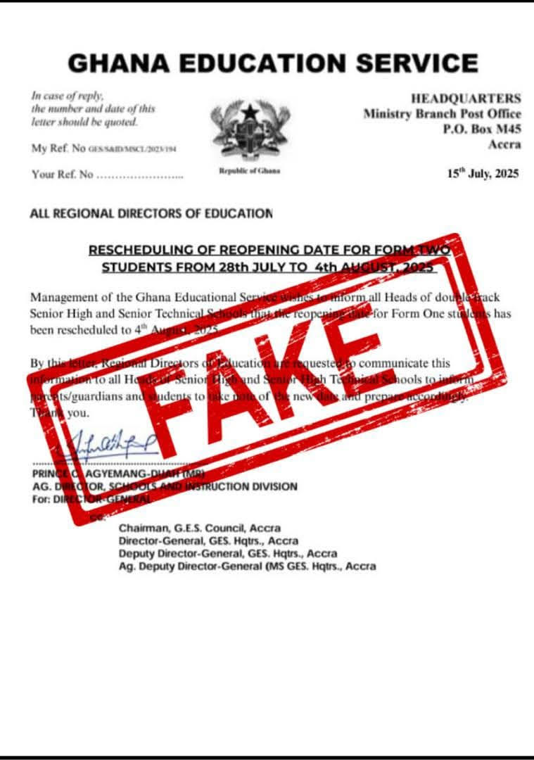 Management of the Ghana Educational Service wishes to inform all Heads of double-track Senior High and Senior Technical Schools that the reopening for Form One students has been rescheduled to 4th August, 2025.