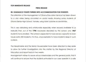 “The attention of the Management of Ghana Education Service has been drawn to a viral video being circulated on social media showing some students of Ghana Senior High School, Tamale, using toilet cubicles as dormitories.