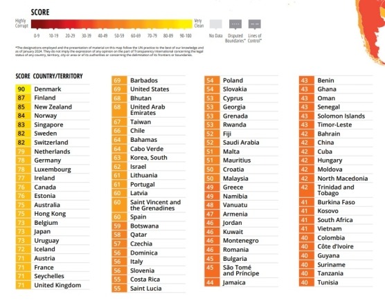 Denmark continues to be the country with the lowest level of corruption in the world for the fifth consecutive year. Close behind are Germany, Ireland, Luxembourg, the Netherlands, Finland, New Zealand, Norway, Singapore, Sweden, and Switzerland. With a score of 73, the UK and Japan are tied for 18th position, followed by France in 72 and the US in 69 (24th).