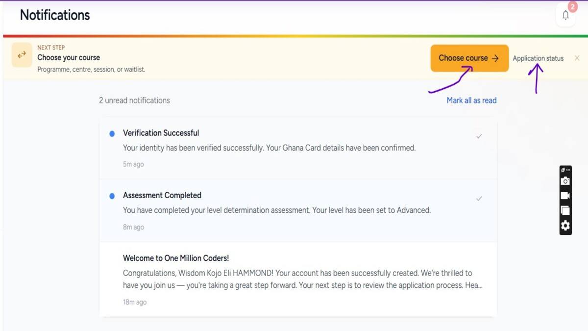 Visit the official portal at app.onemillioncoders.gov.gh and provide your legal name, active email address, and phone number.