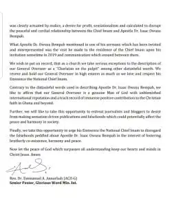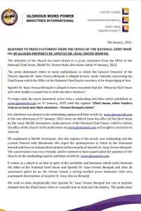 In a press statement issued by Apostle Owusu Bempah, he made it clear that he was misquoted. He added that he never mentioned the name of the Chief Imam at church to describe him as persons who come to him to look into their destines. He urged the National Chief Imam to disregard such information from the media.