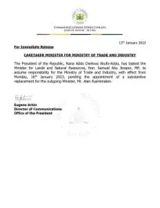 In letter dated, 13th January, 2023 and signed by Eugene Arhin, President Akufo Addo revealed that Samuel Abu Jinapor will act from 16th January, 2023 until substantive minister is appointed fot the trade ministry.