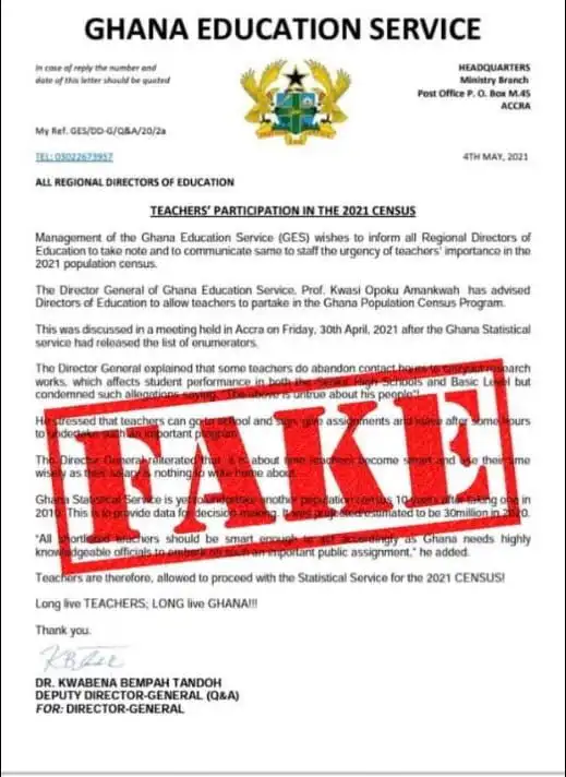 The Ghana Education Service has just declared the letter indicating teachers can take part in the forthcoming 2020 population census as fake.