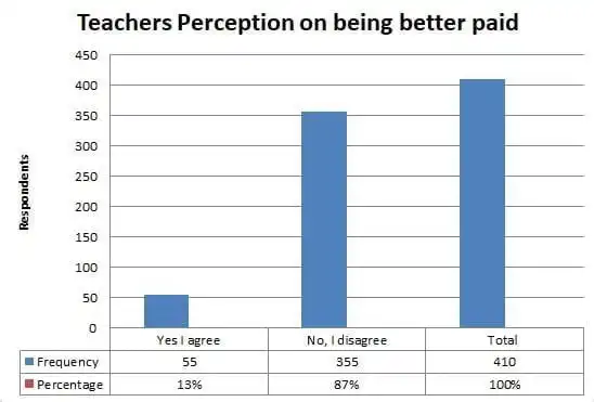 A total of 408 respondents answered this question, which sought to seek the general view of teachers regarding their salary and if they felt they were receiving pay worth their work and effort. Out of the 408 respondents, 55 representing 13% indicated they are paid well while 353 respondents (87%) said No, they are not paid well.