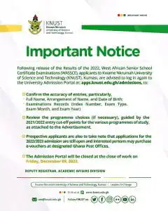 Management of Kwame Nkrumah University of Science and Technology(KNUST) has issued a statement to all 2022 WASSCE Applicants who have applied and wish to be admitted by the University.