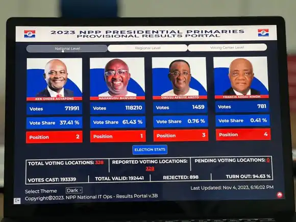 According to preliminary data, Dr. Bawumia received 118210 votes, or 61.43% of the total, while Mr. Agyapong, his closest competitor, received 71991 votes, or 37.41%.