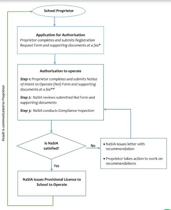 - School proprietor must obtain the Application for authorization from NaSIA, complete it and submit it along with the supporting documentation fee