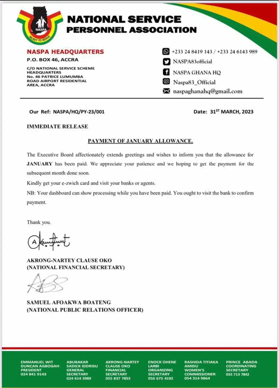 National Service Personnel Association (NASPA) executives have confirmed that the January, 2023 allowance for the 2022/2023 national service batch have been paid.
