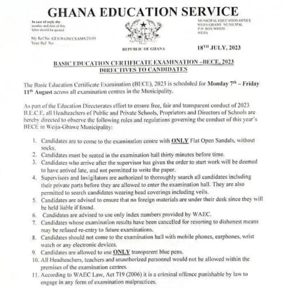 These new 2023 BECE exam rules for candidates are a set of rules made public by the Weija-Gbawe Municipal Education Office of the Ghana Education Service as part of efforts to curb examination malpractices.