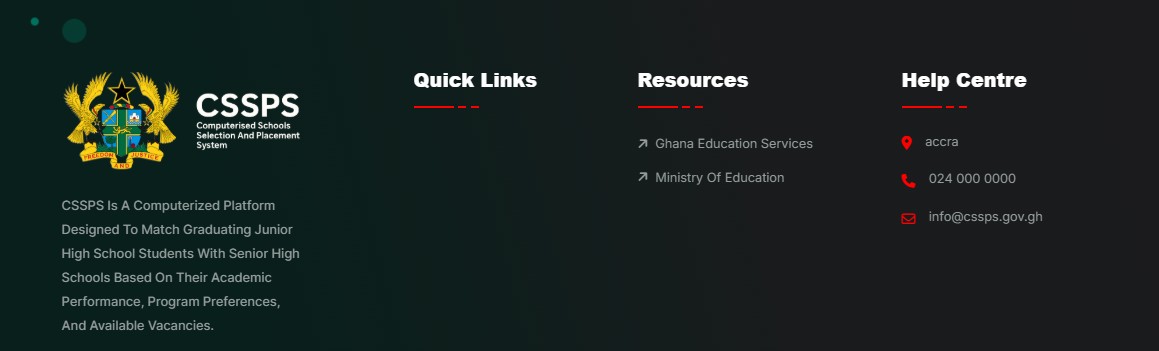 The footer of the site includes all the information provided at the bottom of the home page. On this page one can find the purpose and function of the portal: “CSSPS is a computerised platform designed to match graduating junior high school students with senior high schools based on their academic performance, programme preferences, and available vacancies.”