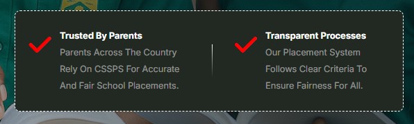 The messages read as follows: Trusted by Parents – Parents across the country rely on CSSPS for accurate and fair school placements and Transparent Processes – Our placement system follows clear criteria to ensure fairness for all.