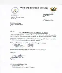 I write to respectfully inform you that the National Teaching Council is, from this year 2023, implementing fully the fees as approved by the Parliament of the Republic of Ghana.