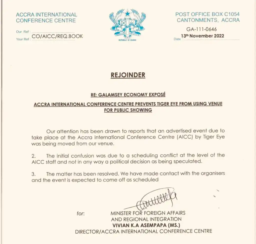 Following the announcement of Tiger Eye of a last-minute cancellation of their Accra International Conference (AICC) venue for the much anticipated Galamsey Economy, the management of the facility has indicated that the premiering of the Galamsey Economy will take place at the facility as announced earlier.