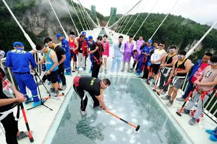 Photos showing how the Chinese glass bridge was tested before people were allowed to cross or before it was used have...