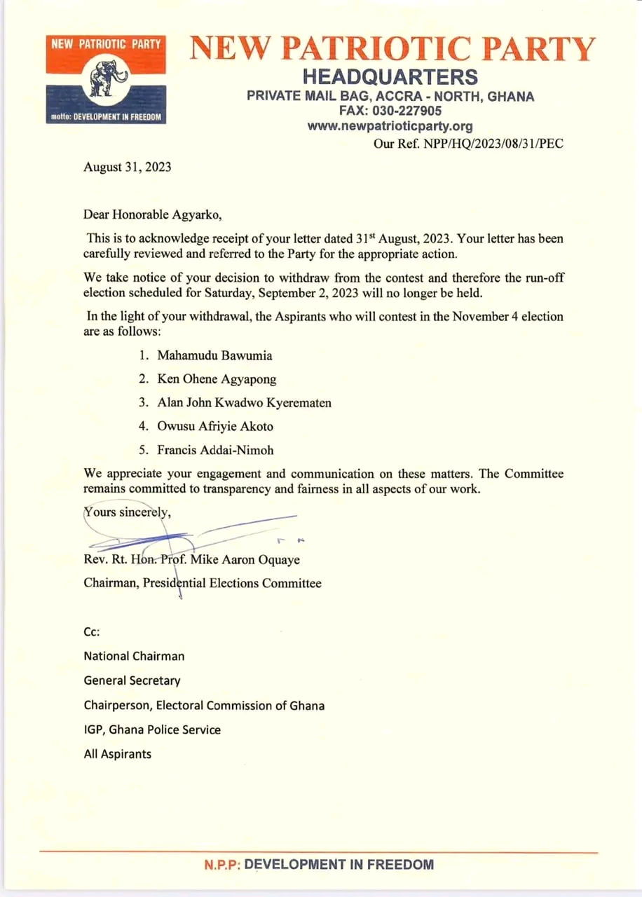 In a letter signed by the chairman of the Presidential election committee, Rt. Hon. Prof. Aaron Mike Oquaye, NPP acknowledged what Boakye Agyarko did.