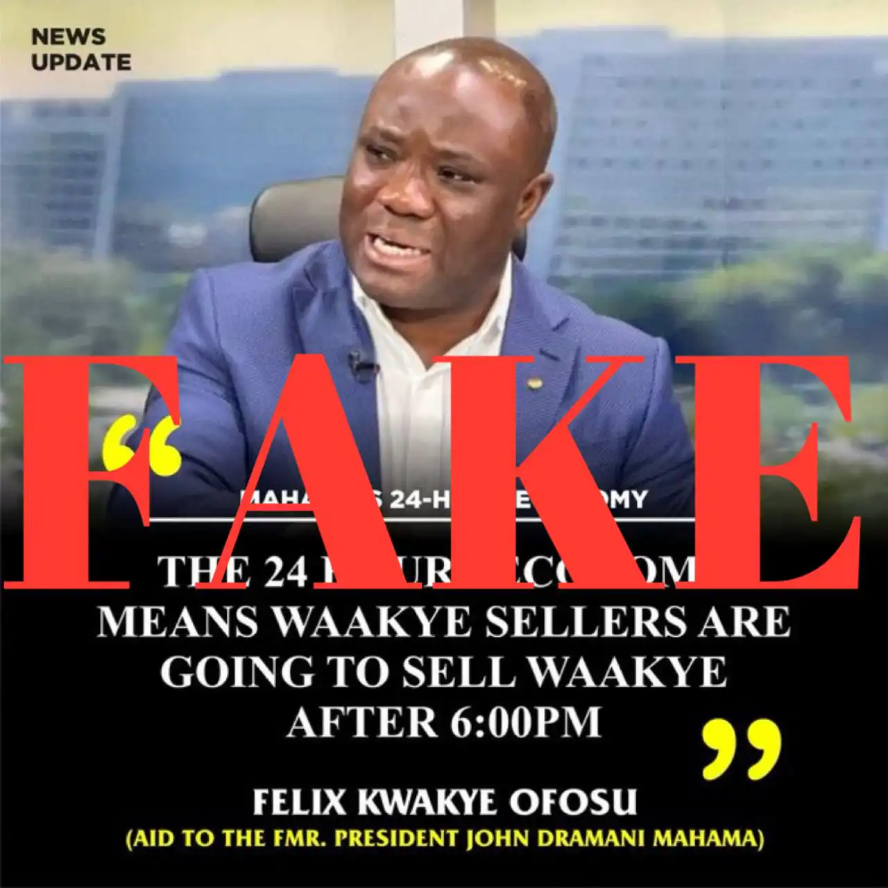 The 24-Hour Economy means Waakey sellers are going to sell Waakye after 6 pm. This is attributed to Felix Kwaakye Owus, however, it is false.