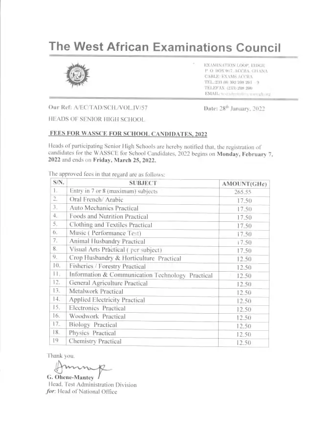 The cost of the examination for candidates writing 7 or 8 subjects is GHS265.55 while the cost of WASSCE practices ranges between GHS12.5 and GHS17.5 per practical.