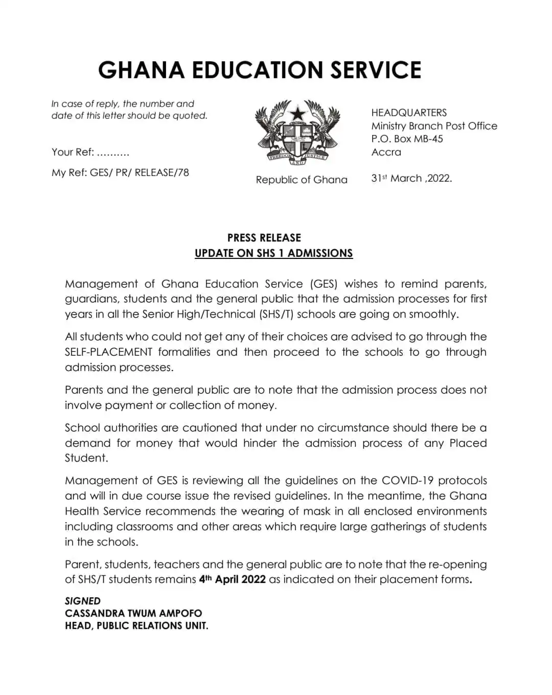 In a related development, the Ghana Education Service has disclosed that, first-year students who have gained admission into secondary schools are expected to report to school on 4th April as communicated earlier. Parents students, teachers, and the general public are to note that the re-opening of SHS/T students remains 4th April as indicated on their placement forms.